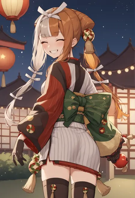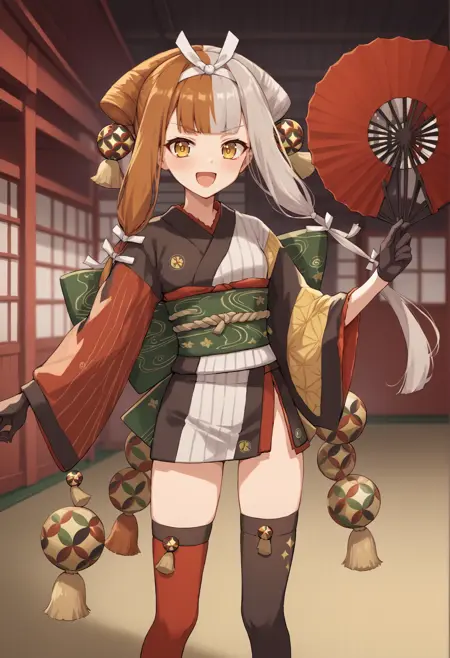 Costume 1: japanese clothes, kimono, gloves, wide sleeves, multicolored kimono, bell, thighhighs, Mismatched Legwear, mismatched gloves,