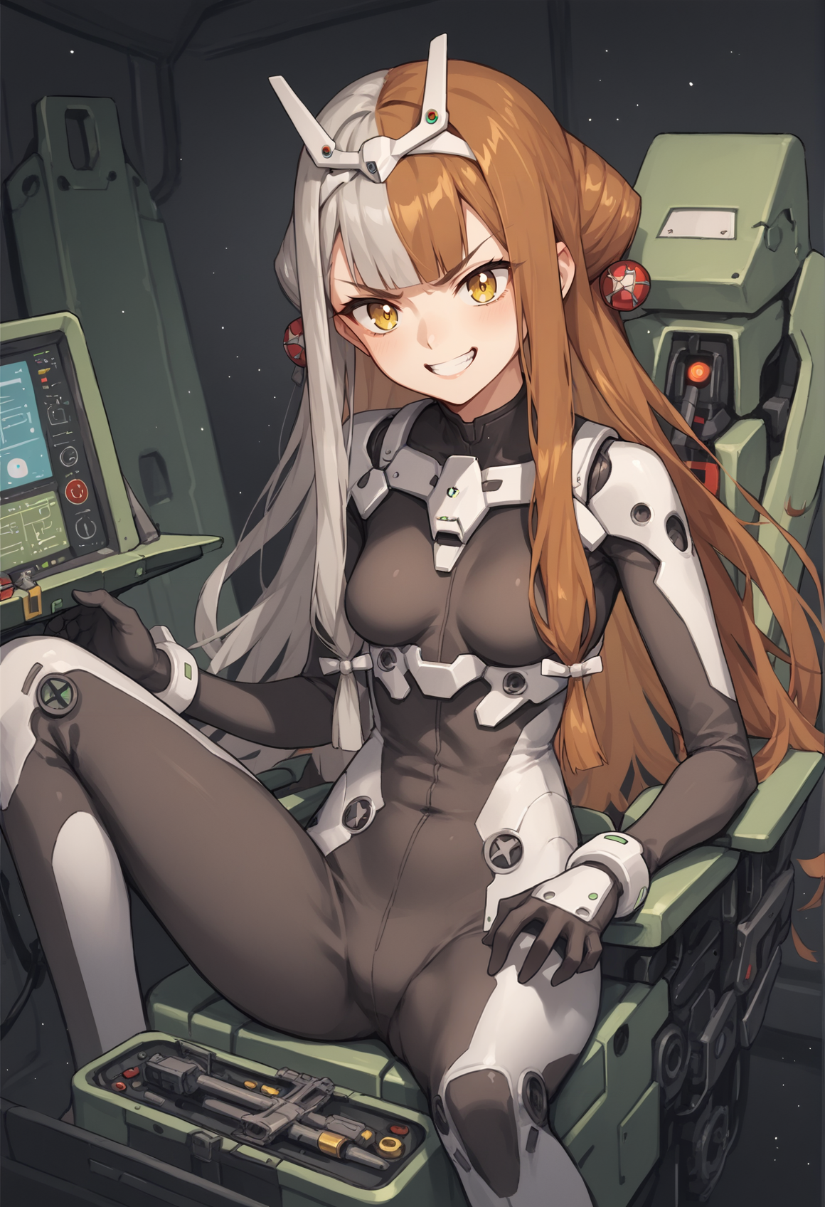Notable tags: yellow eyes, split-color hair, multicolored hair, hair ornament, sidelocks, blunt bangs, two-tone hair, brown hair, grey hair, long hair