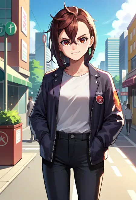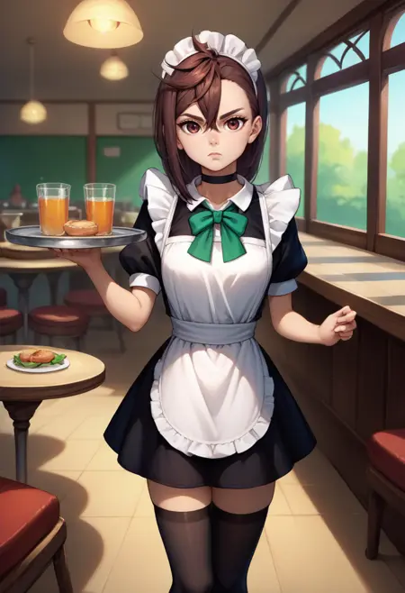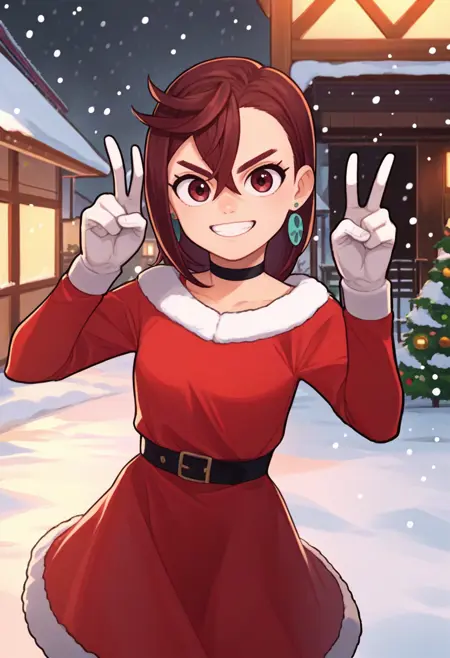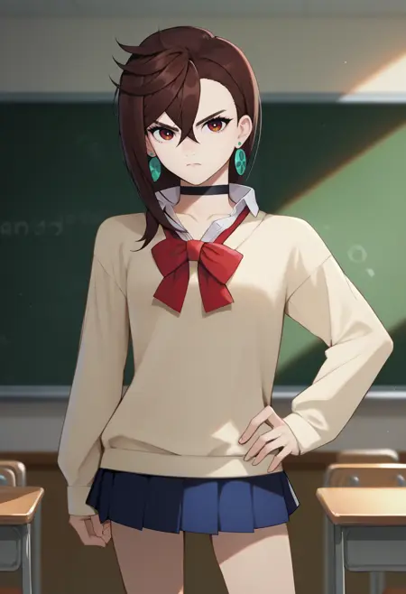 기본 복장: 학교 유니폼, 갈색 스웨터, 긴 소매, 흰색 셔츠, 칼라 셔츠, 빨간 리본, 파란 치마, 주름 치마, 귀걸이, 검은 초커