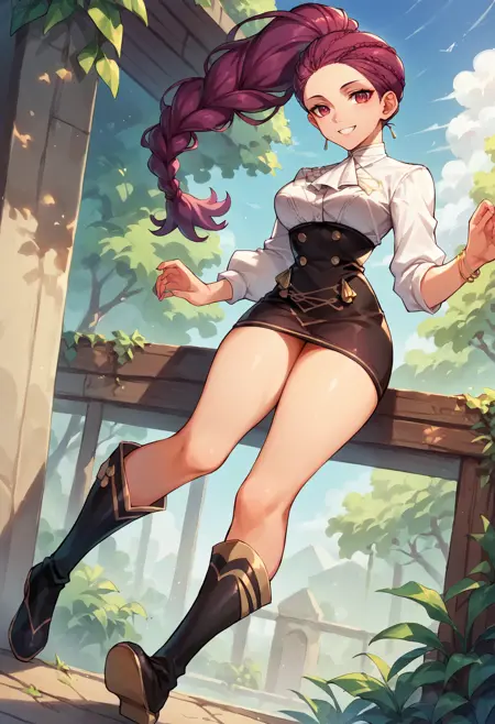 • 对于时间跳跃后的服装,你可能需要将_编成马尾_ 和 夹克 加入负面提示,因为不知为何,该LoRA有时会自动给她加一件夹克。我建议使用“成熟女性”