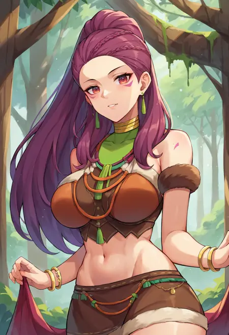 • 时间跳跃后petra-ts, 手镯,辫子,胸部,棕色露脐上衣,棕色裙子,耳环,面部纹路,毛皮镶边,高马尾,长发,单袖上衣,紫色头发,金色项圈,不对称裤装,手镯,吊带领,成熟女性,露腹,毛皮镶边服装