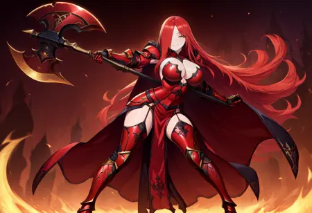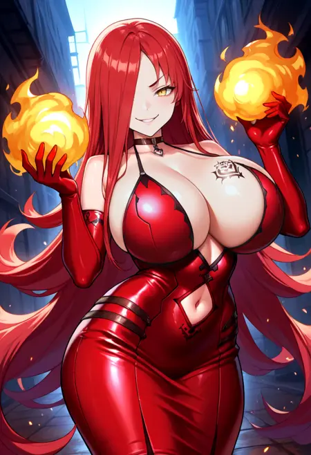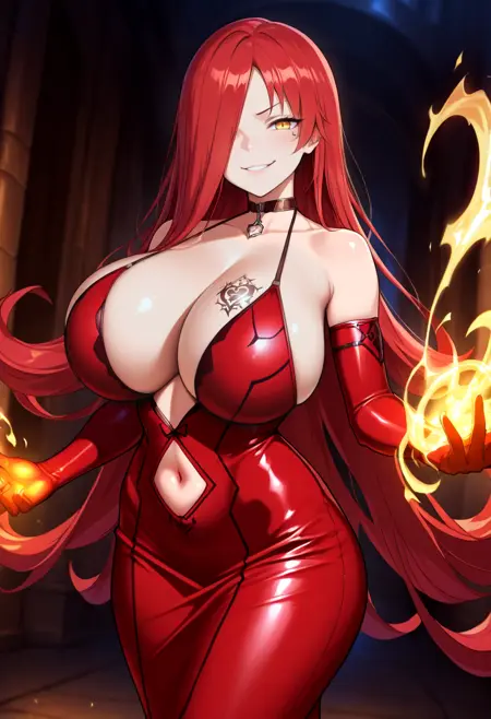 デフォルトの衣装: ml-astarog, チャイニー、くびれ、肘まで手袋、毛皮のトリム、片目を髪で隠す、へそ開き、赤いドレス、赤い手袋、赤い髪、ぴったりしたドレス、非常に長い髪、黄色い目、巨乳、ストラップレスドレス、胸のタトゥー、レザーのチョーカー