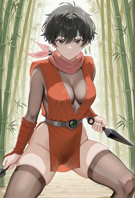 수코덴 1 태그: 매우 짧은 머리, 검은 머리, 검은 눈, 헤드밴드, 닌자, 스카프, 투명, 허벅지 긴 양말, 가슴 노출, 골반 커튼, 손목 밴드, 부츠