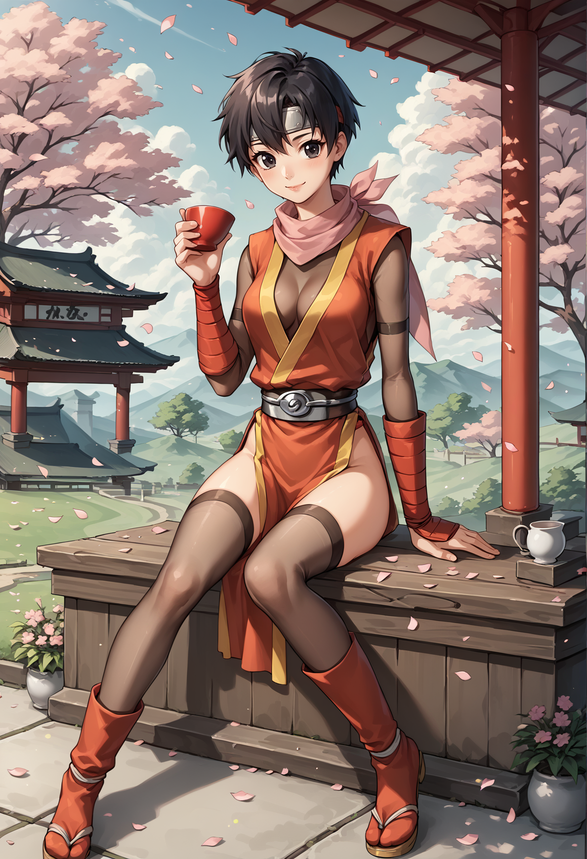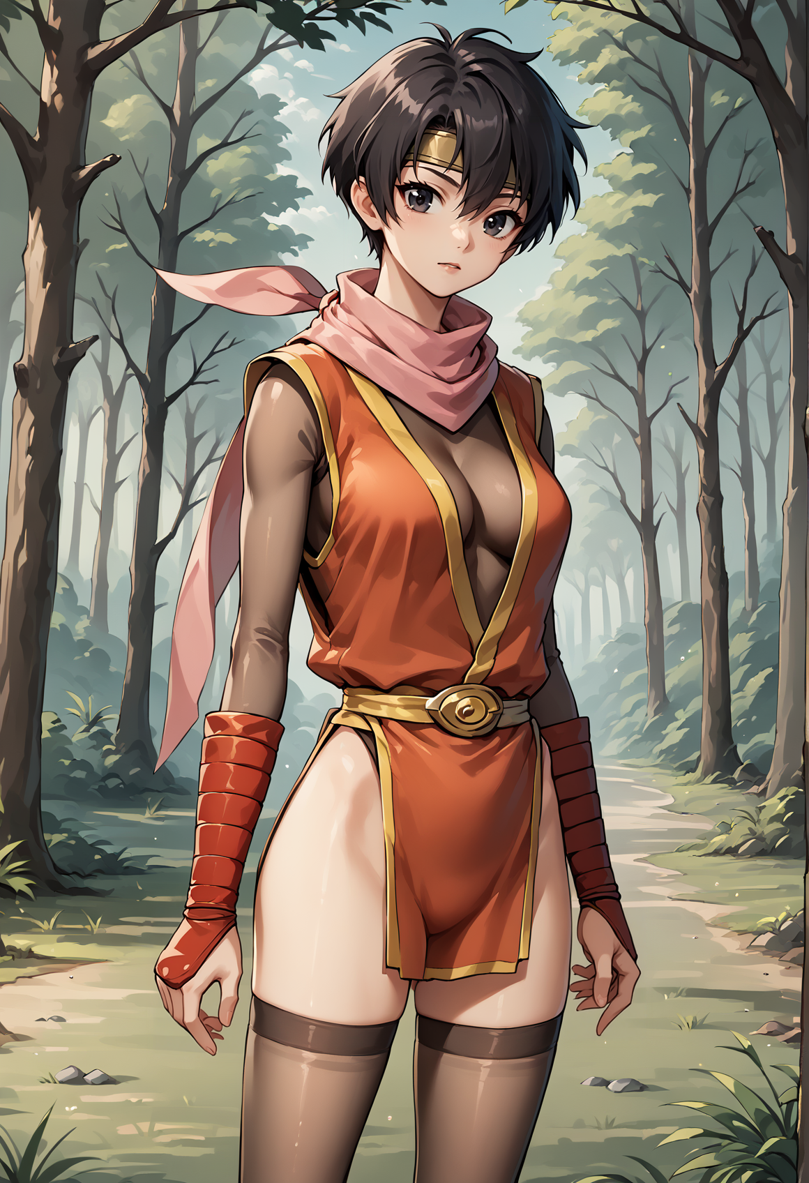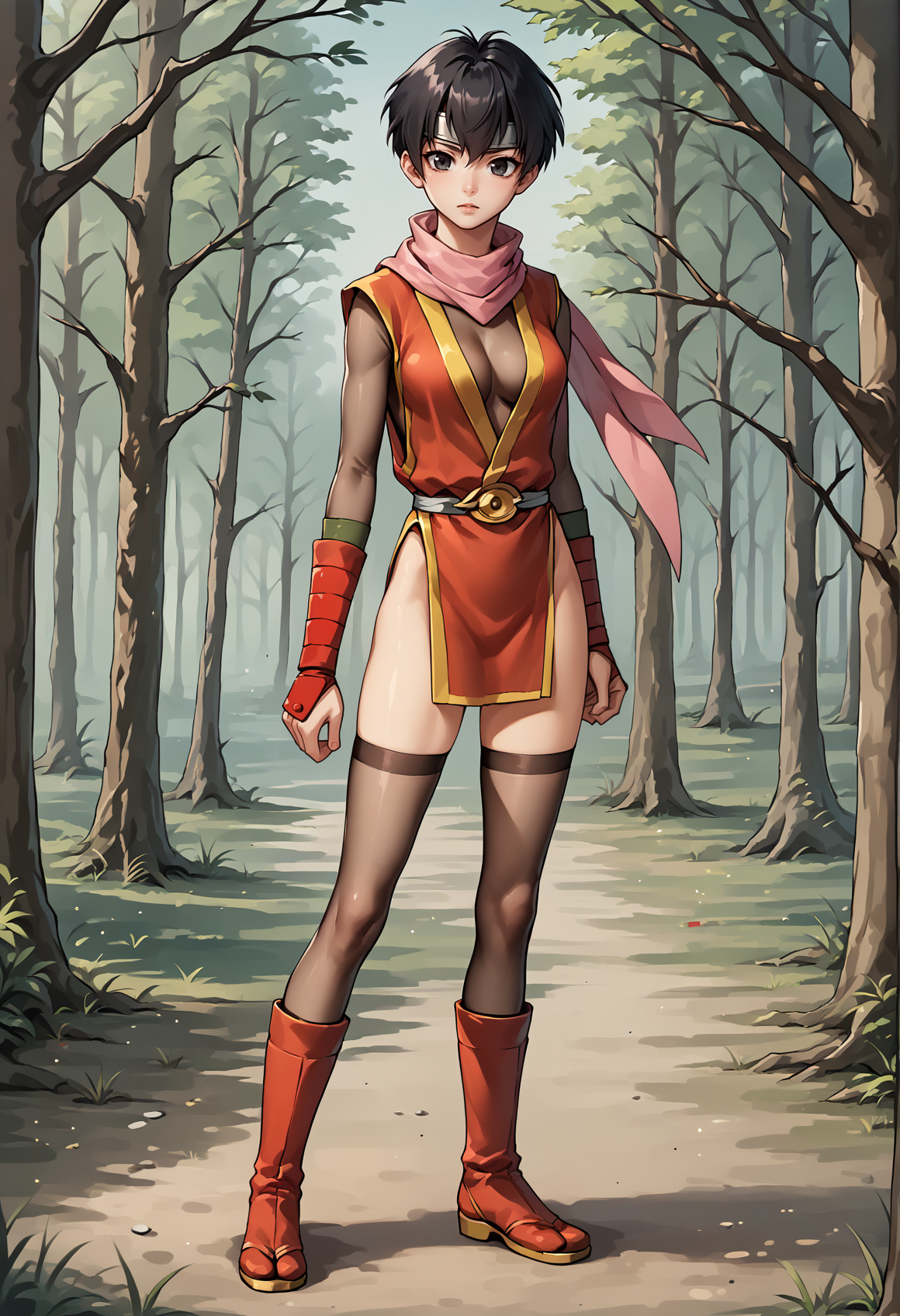 수코덴 1 태그: 매우 짧은 머리, 검은 머리, 검은 눈, 헤드밴드, 닌자, 스카프, 투명, 허벅지 긴 양말, 가슴 노출, 골반 커튼, 손목 밴드, 부츠