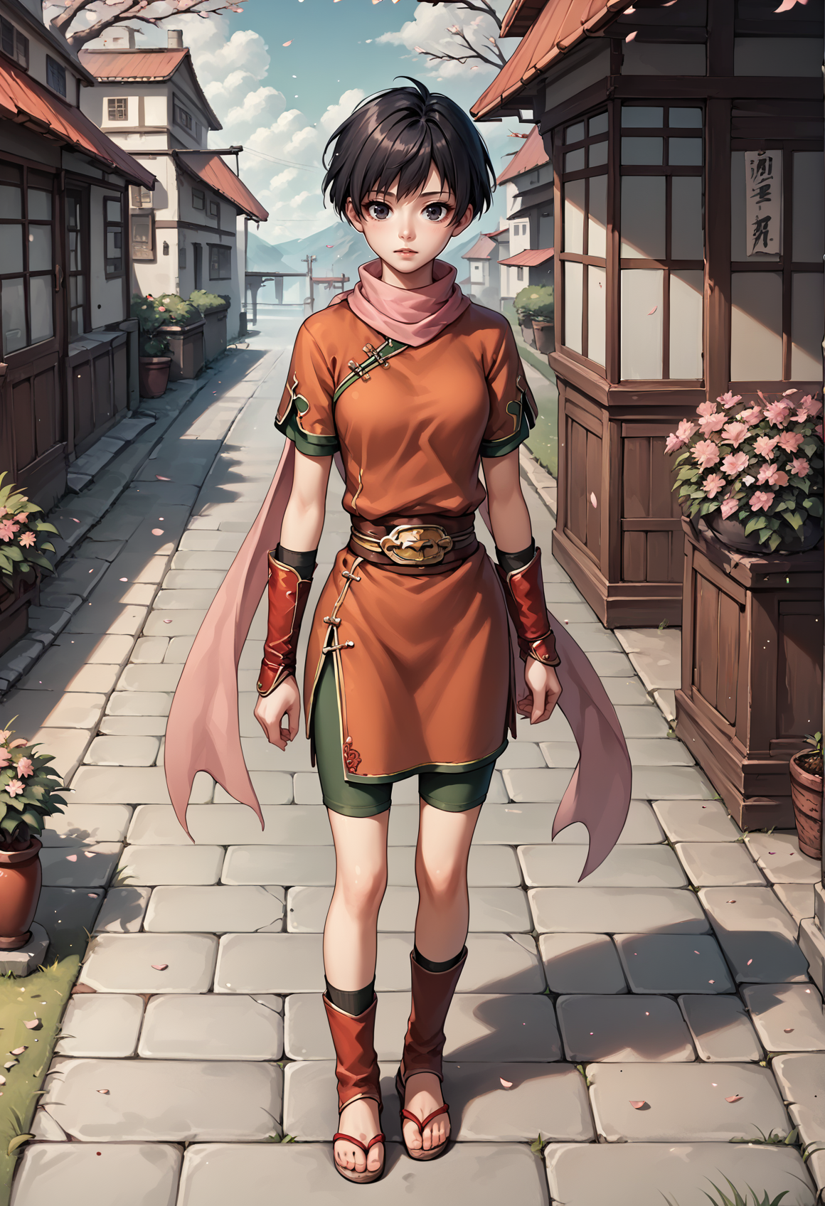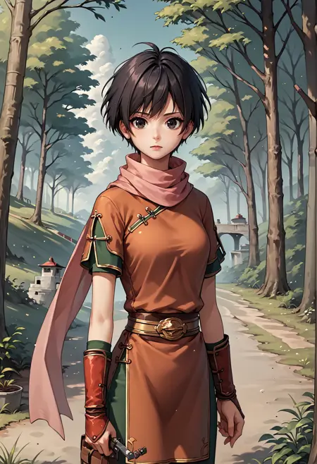 수코덴 2 태그: 짧은 머리, 검은 머리, 검은 눈, 스카프, 중국 옷, 짧은 소매, 결혼식 장갑, 샌들