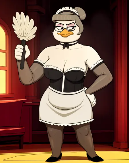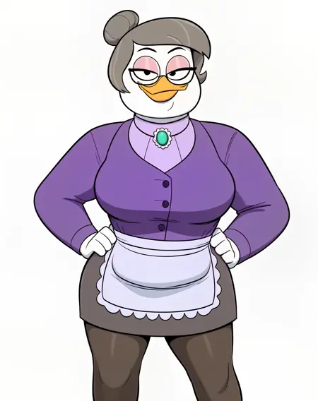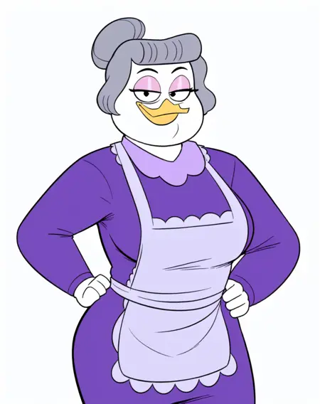 bentina beakley, duck, beak, white skin, brown hair, greying hair, hair bun, black eyes, pink eyeshadow, eyeliner, orange legs, webbed feet