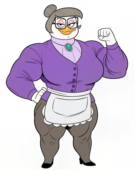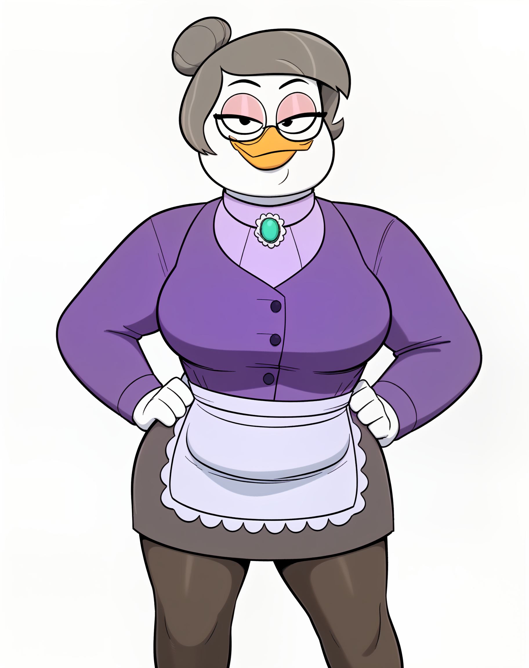 purple clothing, long sleeves, apron, skirt, legwear, pantyhose, high heels, eyewear, glasses, button (fastener), slightly chubby, muscular female