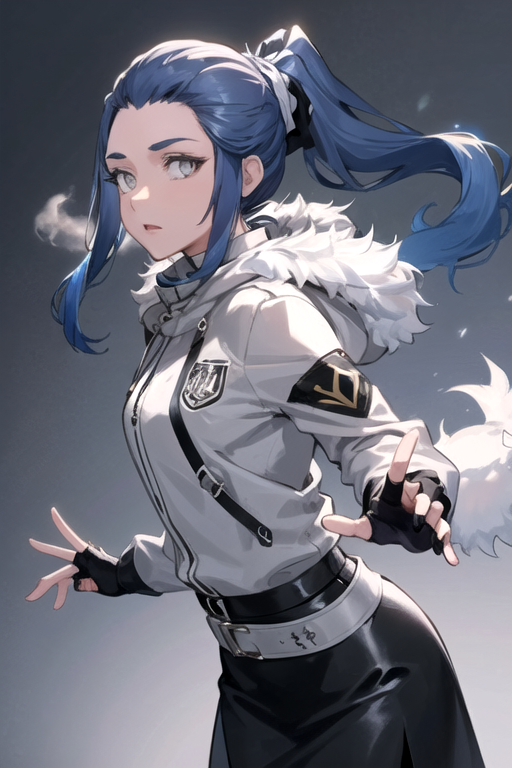 GaramJahad, 1girl, solo, long hair, black skirt, black gloves, long sleeves, blue hair, ponytail, belt, hood, fingerless gloves, grey coat, grey eyes, fur trim,