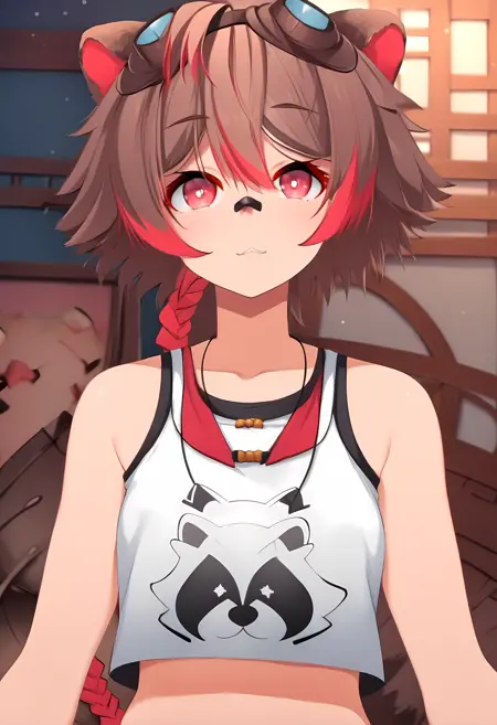Rakkun, animal ears, multicolored hair, brown hair, virtual youtuber, red hair, bandaid on nose, bandaid on face, raccoon ears, short hair, red eyes, hair between eyes, raccoon girl, tail, raccoon tail, streaked hair, goggles on head