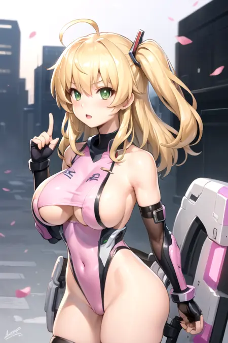 LilyHeavyMetal, 1girl, solo, long hair, blonde hair, large breasts, hair ornament, thighhighs, fingerless gloves, bare shoulders, green eyes, ahoge, side ponytail, pink leotard, sideboob, one side up,