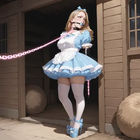 dr3ss 착용, 파란색 실크 메이드 복장, 짧은 치마, 푸프티, ((볼륨감 있는 넓은 짧은 치마)), 프릴, 앞치마, 플랫폼 힐, 발목 리본, 허벅지 스타킹