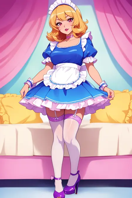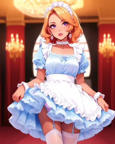 提示词辅助:厚底高跟鞋、脚踝束带、裙撑、大腿袜、绝对领域、围裙、发带等