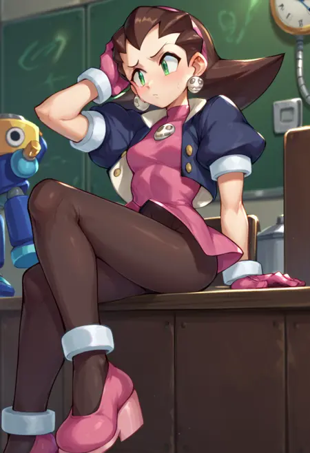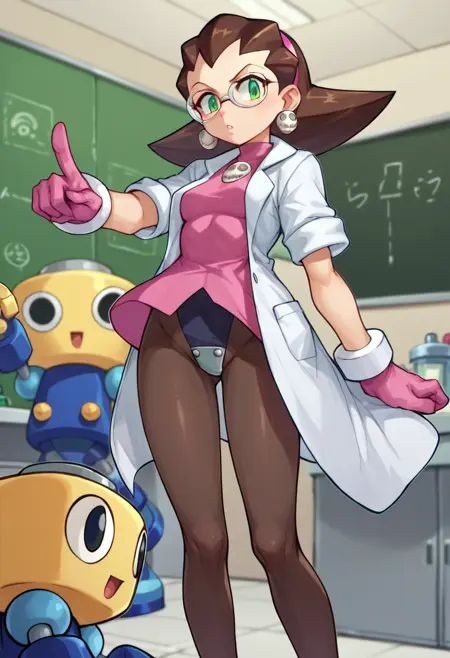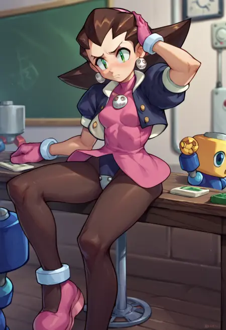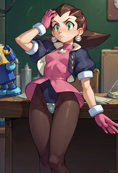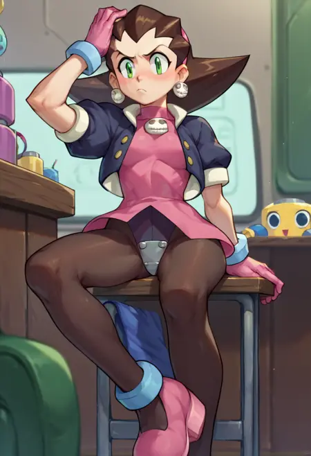 特隆·邦娜(洛克人),绿色眼睛,短发,棕色头发,珠宝,黑色丝袜,耳环,露肤服装,粉红色鞋子,头发束起,粉色手套,粉色发带,腹甲,粉色T恤,实验室大衣,眼镜,