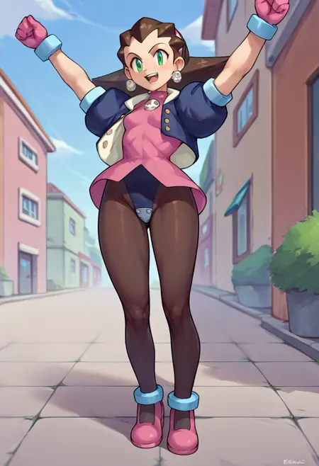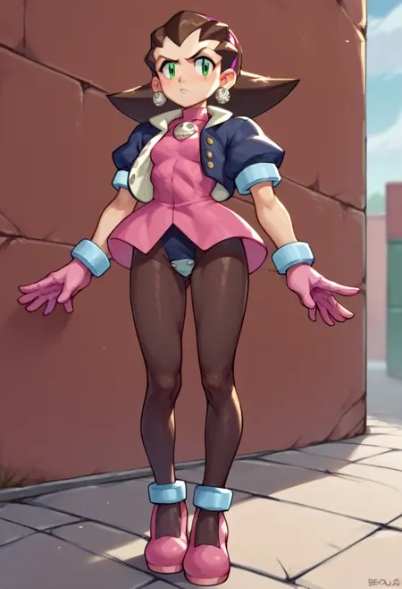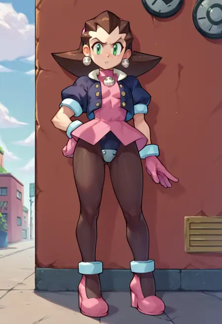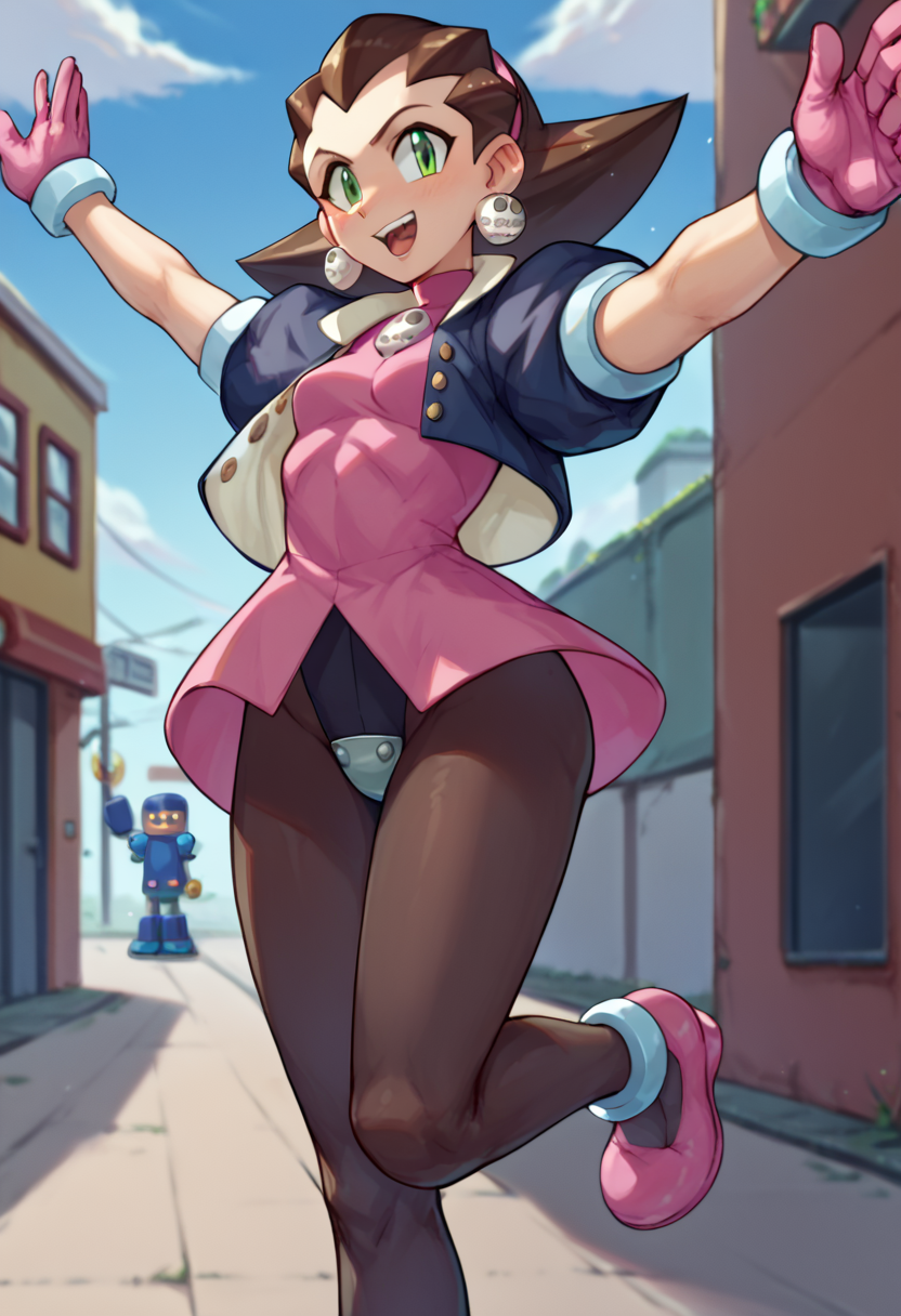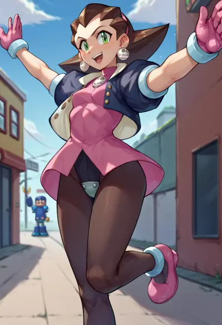 特隆·邦娜(洛克人),短发,棕色头发,珠宝,绿色眼睛,黑色丝袜,耳环,露肤服装,敞开夹克,蓬松短袖,短夹克,短款夹克,粉红色鞋子,头发束起,粉色手套,粉色发带,腹甲,粉色T恤,