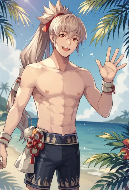 FEH ビーチウェア: sumTakumi、ポニーテール、長い髪、上半身裸、水着