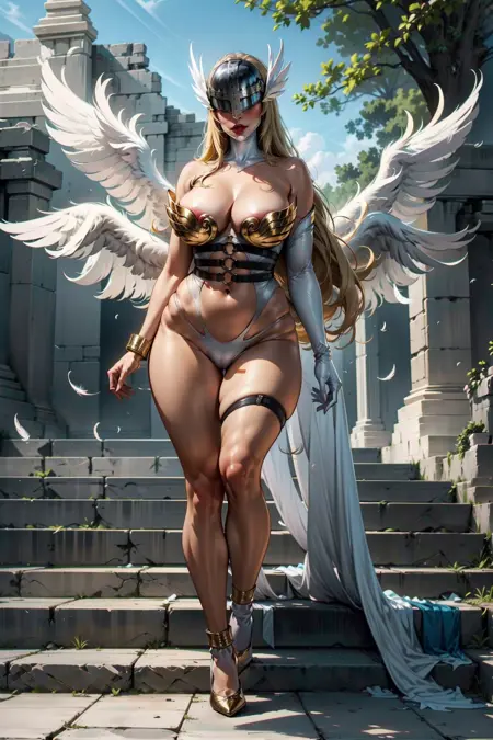 프롬프트: 골든 브라, 다리, (최고 품질, 걸작:1.2), 초세밀, angelwomon, 1소녀, 가슴, 단독, 긴 머리, 배꼽, 금발 머리, (여러 개의 날개), 깃털 날개, 큰 가슴, 가린 눈, 헬멧, 천사 날개, O 링, 장갑, 벌거벗은 어깨, 가슴 사이 틈, 머리 날개, 흰색 장갑, 흰색 날개, 피부 주름, 얼굴 홍조, 팔꿈치 장갑, 벨트, 벌어진 입술, 유두 노출, 관찰자 바라봄, 입술, 흰색 장갑, 잠금뼈, 한쪽 팔꿈치 장갑, 야외, 배꼽 커팅, 분리된 칼라, 생식기, 드러난 옷, 흰색 하이힐, 스타킹
