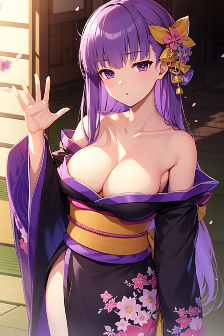 bb, purple eyes, purple hair, long hair, bangs, red hair bow