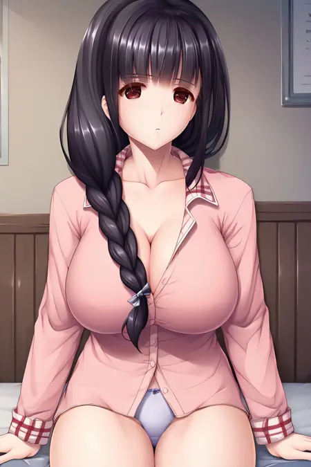긴 머리, 앞머리 땋기, 어깨를 덮는 머리카락, 단일 땋기, (텅 빈 눈:1.2), 무표정, 붉은 눈, 큰 가슴, 머리끈,