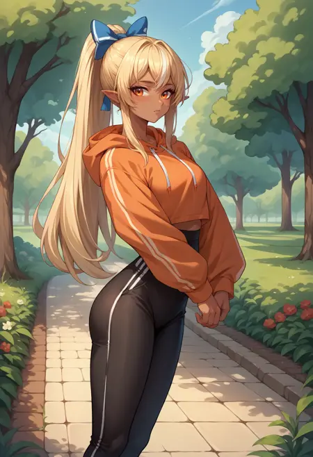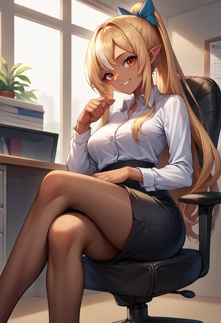 ShiranuiFlare, dark skin, long hair, high ponytail, hair bow