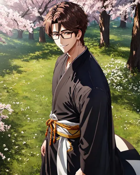 "aizen sousuke,solo,male,short hair,bangs,brown hair,thick eyebrows,brown eyes,white_skin,tall,black-framed_eyewear,"