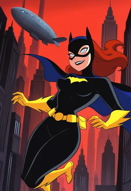 • Batgirl: batgirl, light blue eyes, mask, red hair, black lips, two-tone cape, belt, black bodysuit, yellow gloves