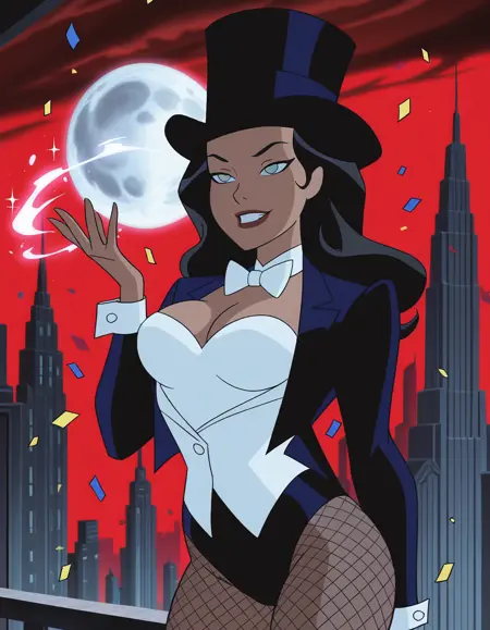 • Zatanna: zatanna zatara, black hair, long hair, large breasts, magician, tuxedo, suit jacket, white bowtie, vest, leotard, pantyhose, sleeve cuffs, top hat, high heels