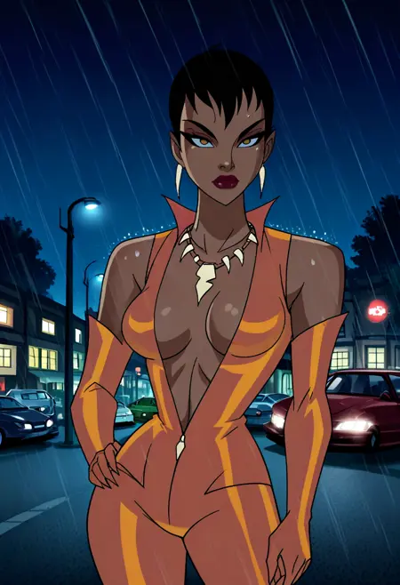 Vixen: vixen, pixie cut, orange eyes, dark skin, tooth necklace, pendant, tooth earrings, tooth belt, orange bodysuit, cleavage, plunging neckline, belt, elbow gloves, claws