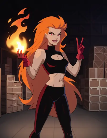 火山:volcana,橙发,极长发,尖刺发型,红眼睛,乳沟开衩,长袖,露脐,臂环,红色手套