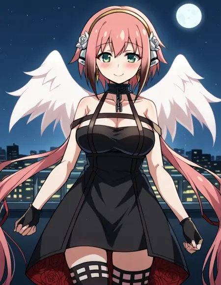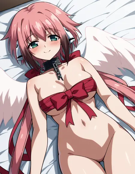 天使翅膀, 裸露肩膀, 断裂的锁链, 锁链, 暴露的胸部, 项圈, 锁骨, 羽毛翅膀, 肚脐, 粉色翅膀, 百褶裙, 红色丝带, 丝带, 机械耳, 裙子, 过膝袜, 白色裙子, 白色过膝袜, 翅膀, 绝对领域,