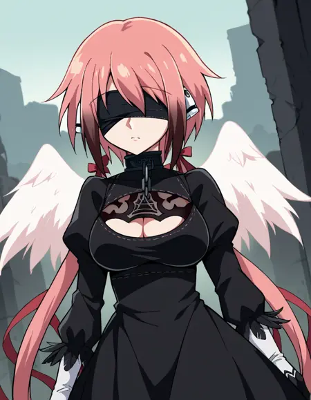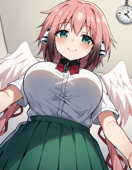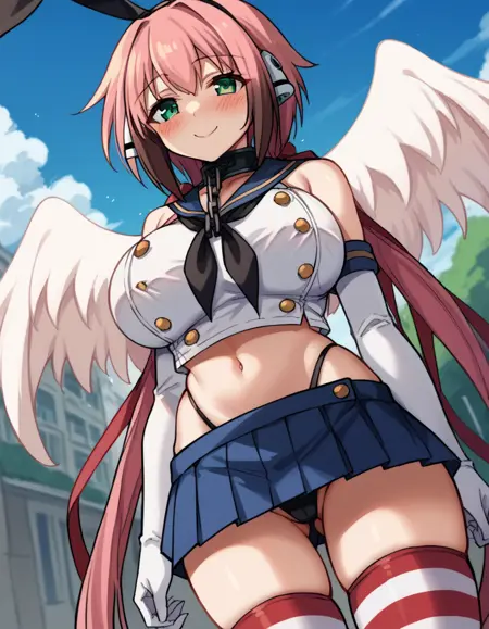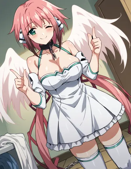 angel wings, bare shoulders, broken chain, chain, cleavage, collar, collarbone, feathered wings, navel, pink wings, pleated skirt, red ribbon, ribbon, robot ears, skirt, thighhighs, white skirt, white thighhighs, wings, zettai ryouiki,