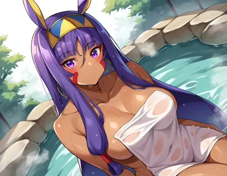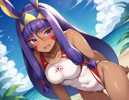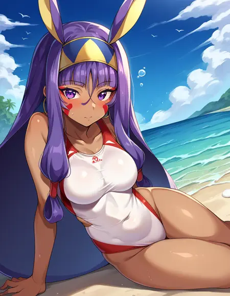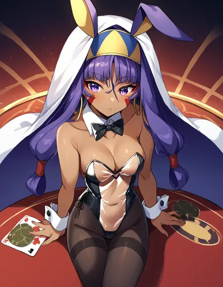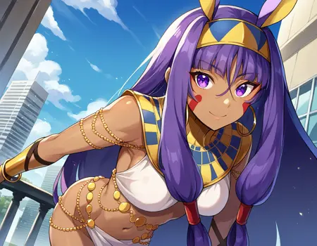 nitocris、動物の耳、黒い肌、黒肌の女性、顔の模様、眉間の髪、長い髪、紫色の目、紫色の髪、側髪、