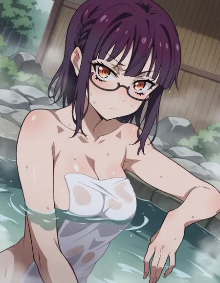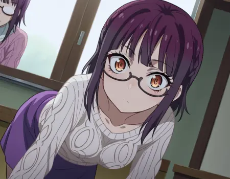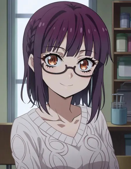 sumika fujimiya, brown eyes, purple hair, braid, glasses, semi-rimless eyewear, under-rim eyewear,