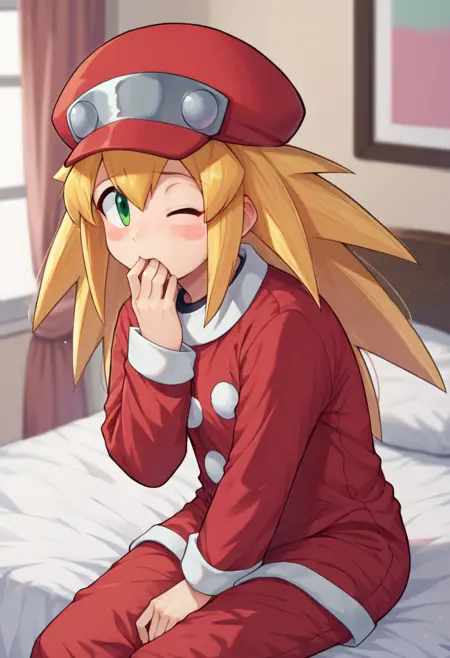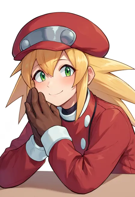 ロール・カスケット(メガマン)、目と目の間の髪、前髪、長い髪、とがった髪、金色の髪、緑の目、赤いタクシー帽、茶色の手袋、短い袖、茶色のベルト、赤いボディスーツ、ジッパー、赤いボディスーツの下に自転車用ショートパンツ、赤いブーツ、