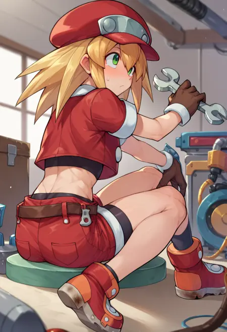 ロール・カスケット(メガマン)、目と目の間の髪、前髪、長い髪、とがった髪、金色の髪、緑の目、赤いタクシー帽、茶色の手袋、赤いジャケット、短い袖、スパナ、茶色のベルト、短めのジャケット、赤いショーツの下に自転車用ショートパンツ、赤いブーツ、へそが隠れている、