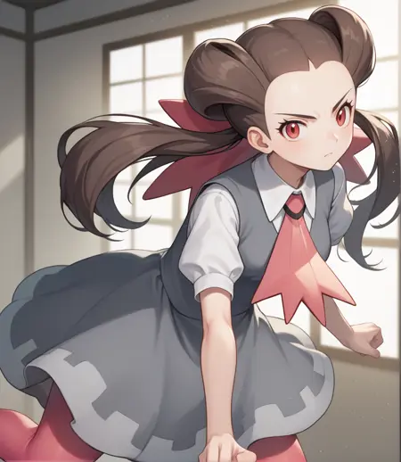 캐릭터: 1girl, roxanne (pokemon), 긴 머리, 뒤로 묶인 머리, 더블 테일, 갈색 머리, 속눈썹, 붉은 눈, 중간 크기의 가슴