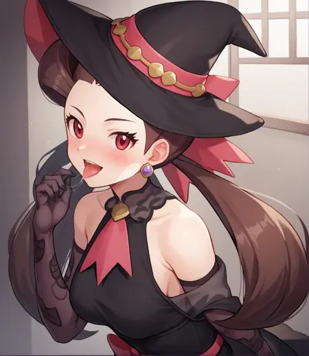 옷 보너스 (Pokémon Masters EX - 마녀): pokemon masters ex, 마녀 모자, 검은 드레스, 핑크 팬티스투킹, 보석, 분홍 리본, 검은 장갑, 검은 머리장식, 어깨 드러냄, 벌거벗은 어깨, 소매 없는 드레스, 팔꿈치 장갑, open_dress, 메리 제인