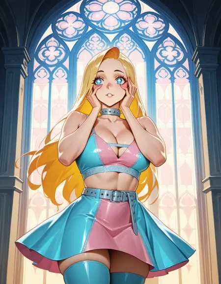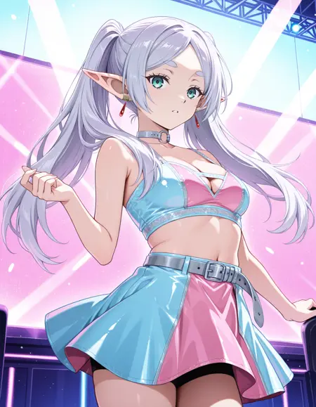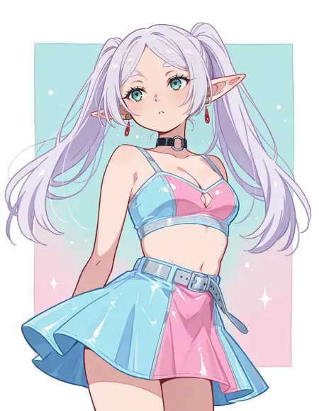 柔和色服装,粉色连衣裙,蓝色连衣裙,多色服装,银色镶边,乳胶,露脐装,露胸剪裁,粉色短上衣,裙子,腰带垂饰,银色腰带,牛仔镜头,项圈