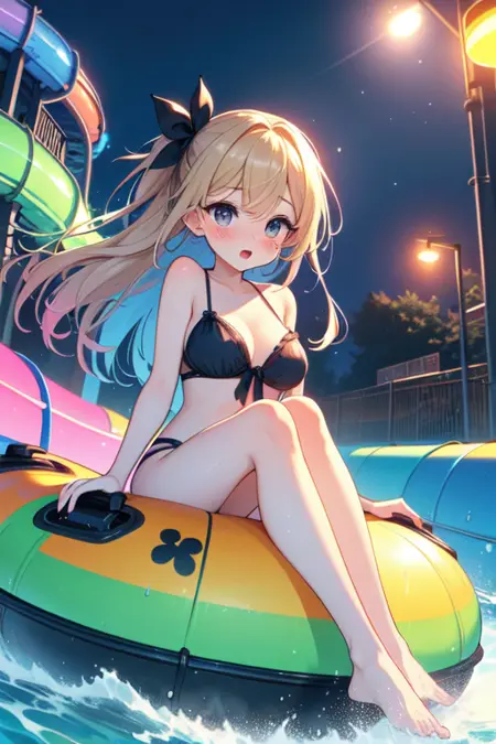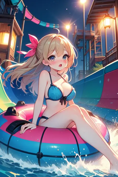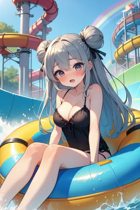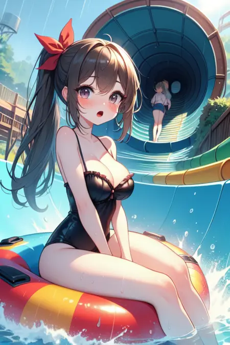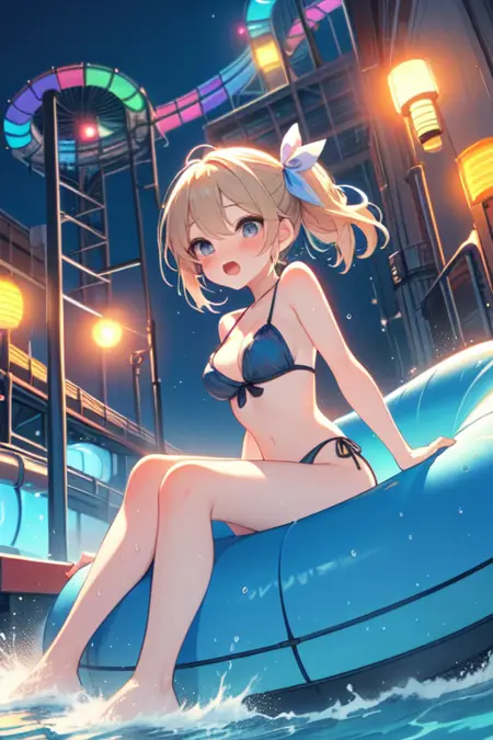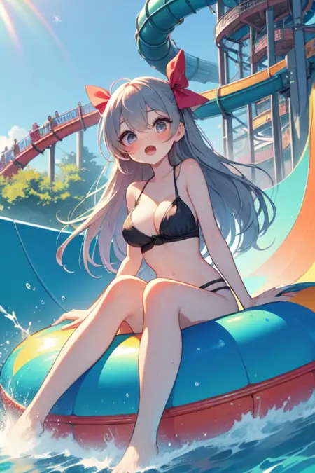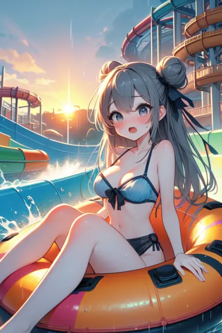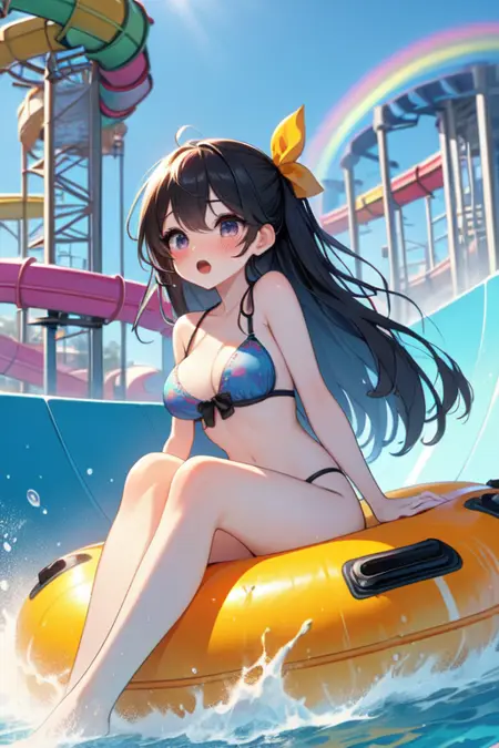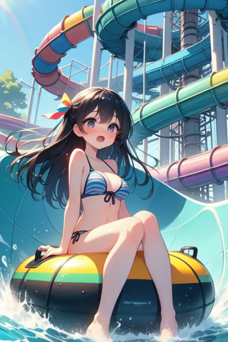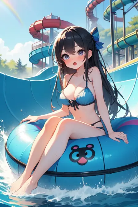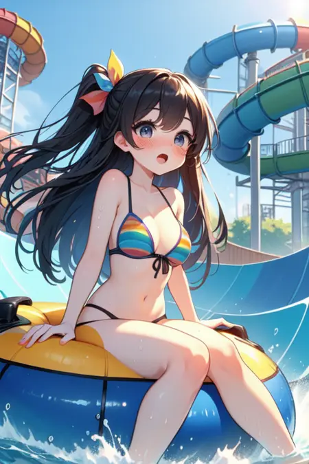 (((from below))), (((spiral waterslide))), ((sitting on colorful funny pattern innertube)), ((splash)), ((wet body)), ((bare legs)), bikini, trees, lazy river, water park,