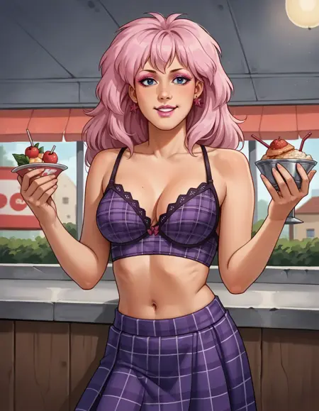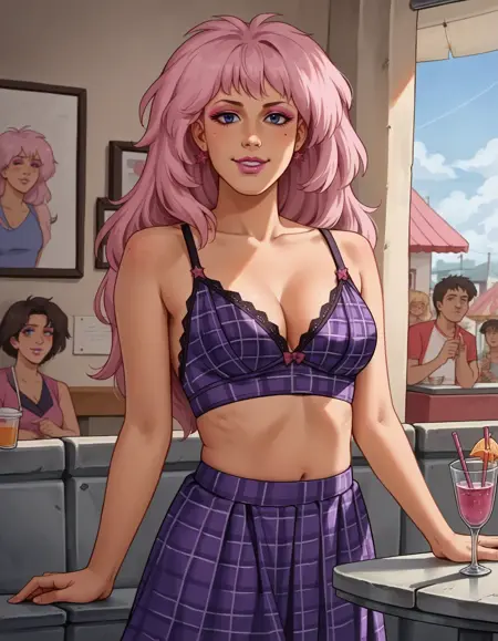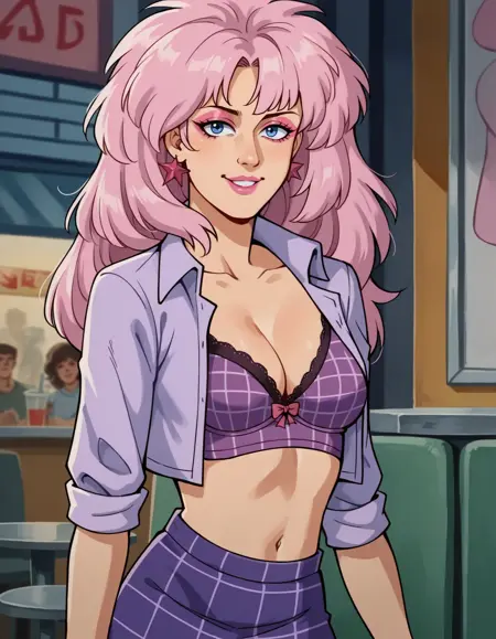 키워드: hud_jem, 1girl, solo, 긴 핑크색 머리카락, 파란 눈, 단단한 긴 소매 핑크색 짧은 드레스, 핑크색 귀걸이, 핑크색 프린지 스카프, 핑크색 아이섀도, 핑크색 립스틱, 미소, 레트로 아트스타일