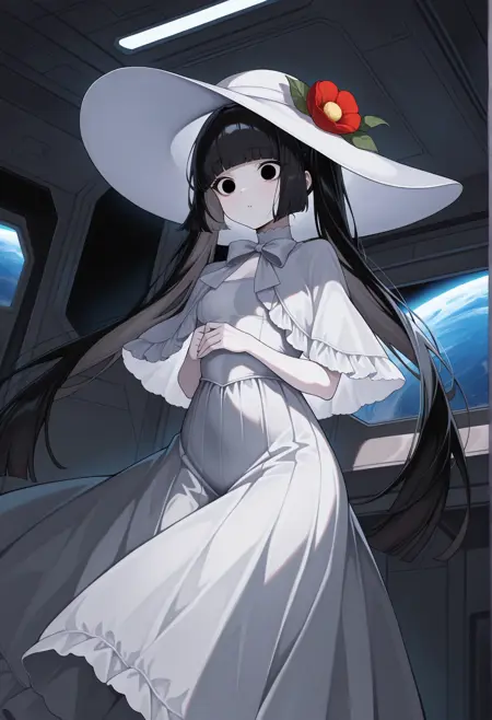 여행 초상: 창백한 피부, 긴 머리, 검은 머리, 검은 눈, 히메 커트, 트윈테일, 큰 모자, 흰 모자, 꽃, 흰 드레스, 프릴, 캐플렛, 긴 치마