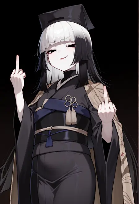 asc2: 창백한 피부, 긴 머리, 그라디언트 머리, 흰 머리, 검은 머리, 검은 눈, 일본 복장, 키모노, 회색 키모노, 오비, 긴 소매, 넓은 소매, 검은 모자, 갈색 망토