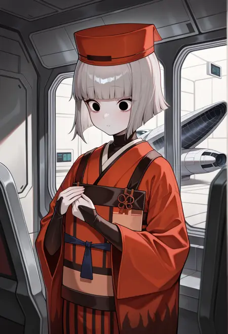 센 노 리큐 asc1: 창백한 피부, 짧은 머리, 회색 머리, 검은 눈, 볼 커트, 일본 복장, 키모노, 빨간 키모노, 띠, 긴 소매, 넓은 소매, 브라이덜 장갑, 빨간 모자,