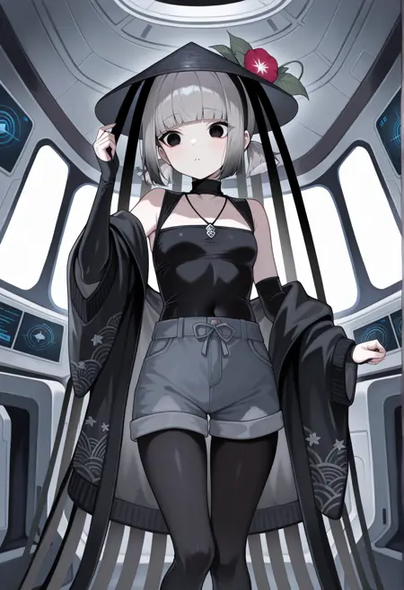 여행 초상: 창백한 피부, 짧은 머리, 회색 머리, 검은 눈, 볼 커트, 낮은 트윈테일, 공식 대체 복장, 큰 모자, 검은 모자, 어깨 노출, 코트, 어깨 드리핑, 반바지, 팬티스타킹, 발가락 없는 하의