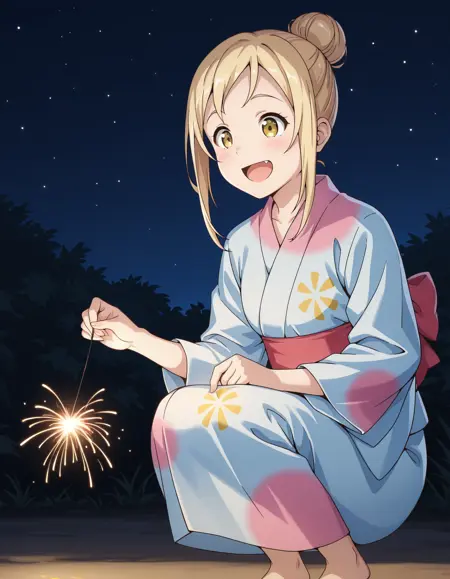- yukata, single hair bun, sidelocks