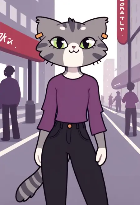 Albatrya, 1girl, cat girl, green eyes, purple shirt and pants,