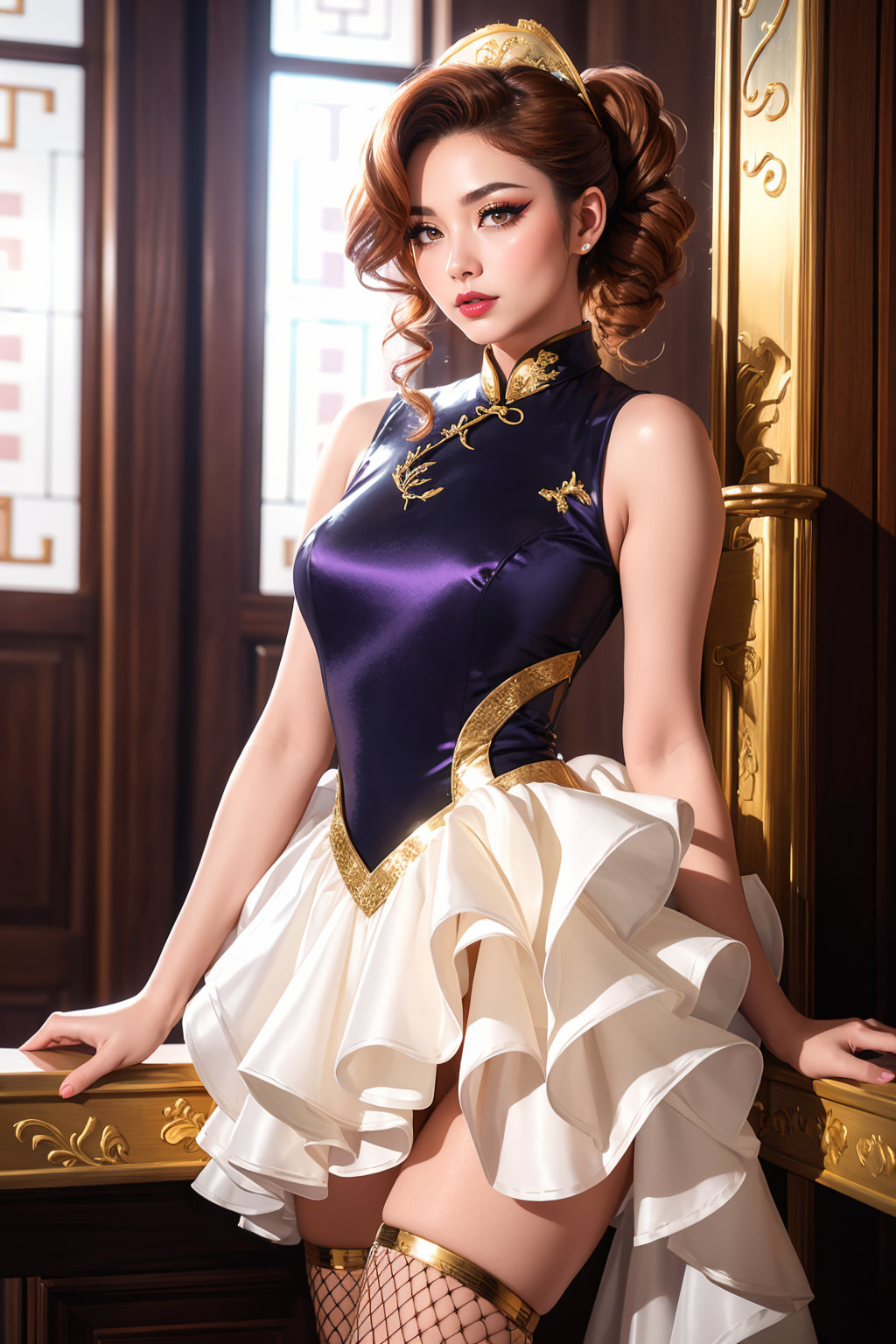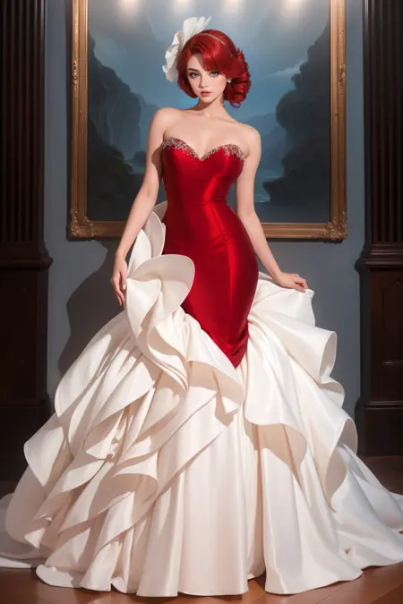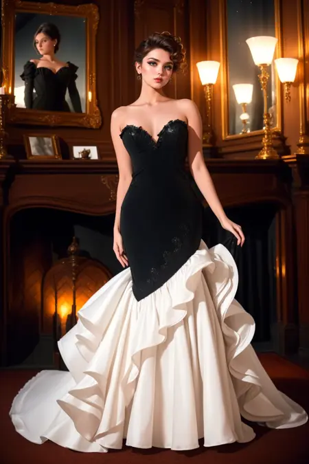 이 모델은 비대칭적인 캐스케이드 드레스로 학습되었지만, 그 점은 잘 이해하지 못했습니다. 대신 이 모델은 정말 많이 주름을 만들고, 물건들을 엄청나게 주름지게 합니다. 매리메이드 스커트나 매리메이드 드레스와 가장 잘 어울립니다.