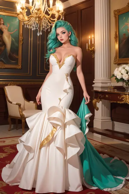 볼륨이 있는 의상과 가장 잘 어울리며, 로브, 드레스, 매리메이드 스커트, 그리고 물론 페플럼과 함께 사용할 때 가장 효과적입니다. 이는 심플한 하트 네크라인의 상의에 내장되어 있어 별도로 지시할 필요가 없습니다.