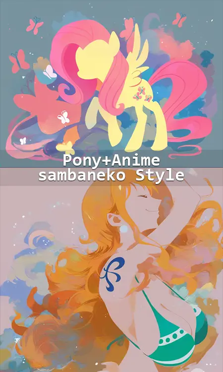 sambaneko 스타일의 LoRA. 이 스타일은 MLP: FIM에 집중한 실루엣 벡터 아트로, 태그와 가중치를 창의적으로 활용하여 높은 유연성을 지닙니다. 말과 애니메이션 실루엣 모두 잘 생성하며, 예상외로 크로스오버 말을 잘 만들 수 있습니다. 이는 기본 모델로 PonyXL V6를 사용했기 때문일 가능성이 높습니다. (참고: AnimagineV31 버전)