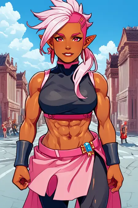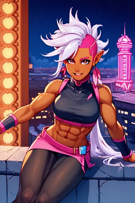 트리거: 1girl, 검은 피부, 뾰족한 귀, 단발, 모하awk, 언더컷, 꼬리辫, 크롭탑, 팔 없음, 허리, 귀걸이, 치마, 팔찌, 스타킹