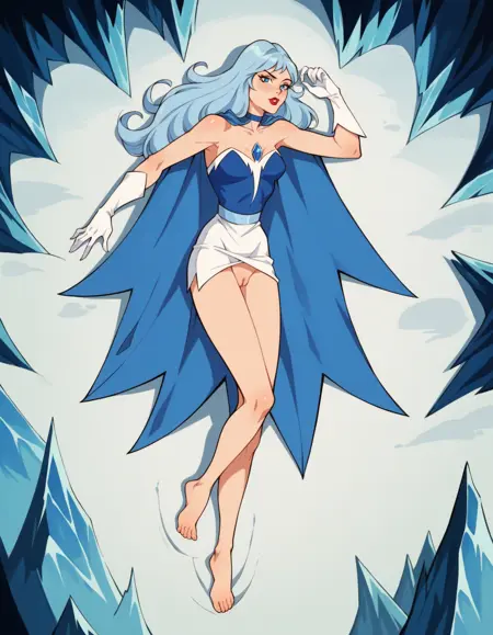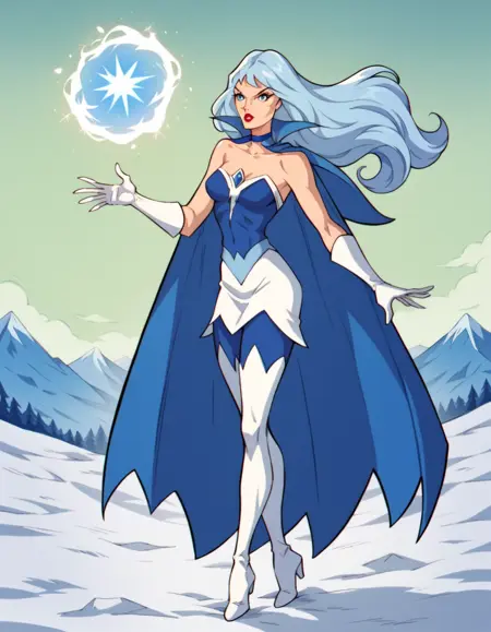 키워드: hud_frosta_shera, 1girl, solo, 긴 파란 머리, 파란 눈, 단단한 파란색과 흰색 짧은 드레스, 스트랩 없음, 드러난 어깨, 파란 카고, 망토, 파란 가슴 보석, 파란 팬티홀스, 흰색 허벅지 부츠, 흰장갑, 마법, 립스틱, 레트로 아트스타일